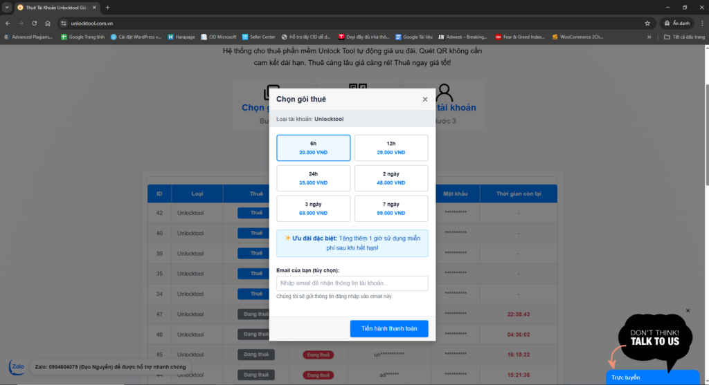 Bước 1: Truy cập và Chọn gói thuê phù hợp Truy cập vào trang chủ https://unlocktool.com.vn. Bạn sẽ thấy ngay các gói thuê được liệt kê rõ ràng theo thời gian sử dụng (ví dụ: 3 giờ, 6 giờ, 12 giờ, 1 ngày…) cùng mức giá tương ứng. Hãy chọn gói phù hợp với nhu cầu công việc của bạn.